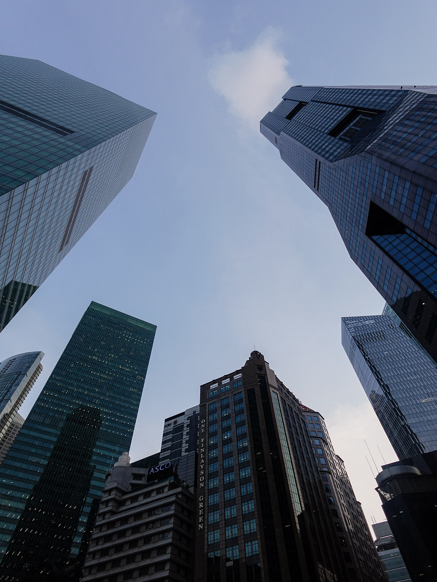 An upward perspective emphasizing scale and ambition, reflecting the dominance of modern architecture in everyday urban life..